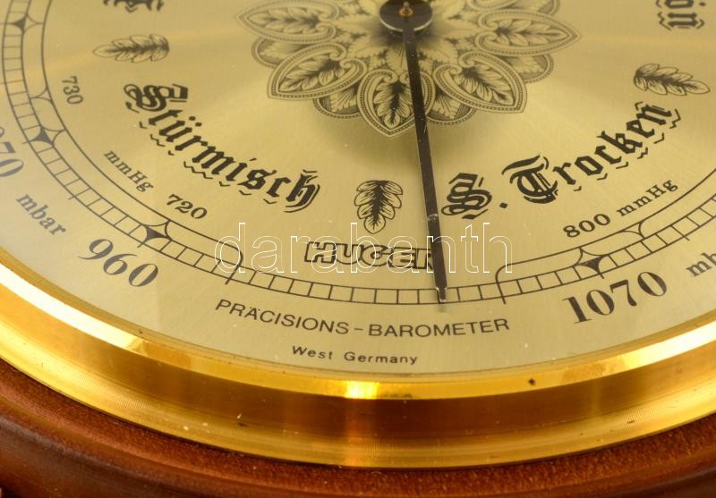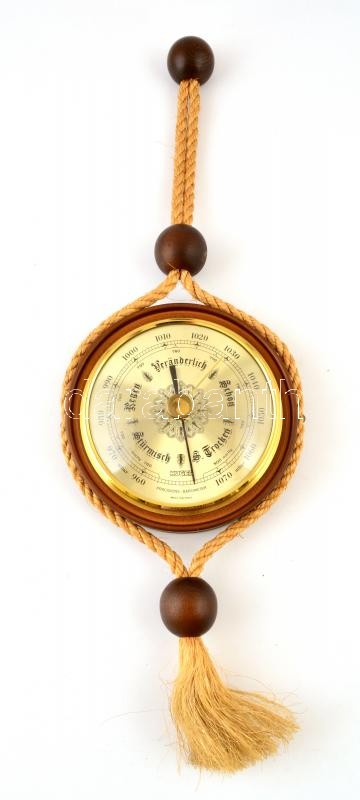 Leírás: Falra akasztható fa keretes barométer, jó állapotban, d: 15,5 cm