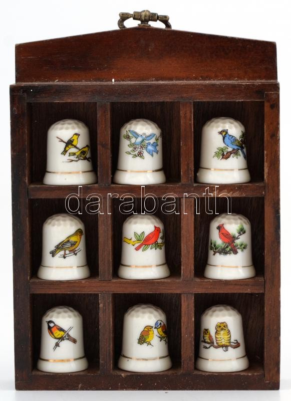 Leírás: Madármotívumokkal díszített 9 db porcelán gyűszű, fa tartóban, 11×14 cm