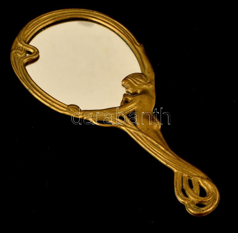 Szecessziós stílusú réz kézi tükör, h: 24 cm