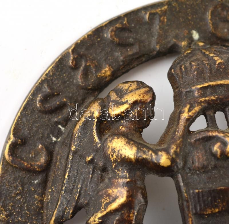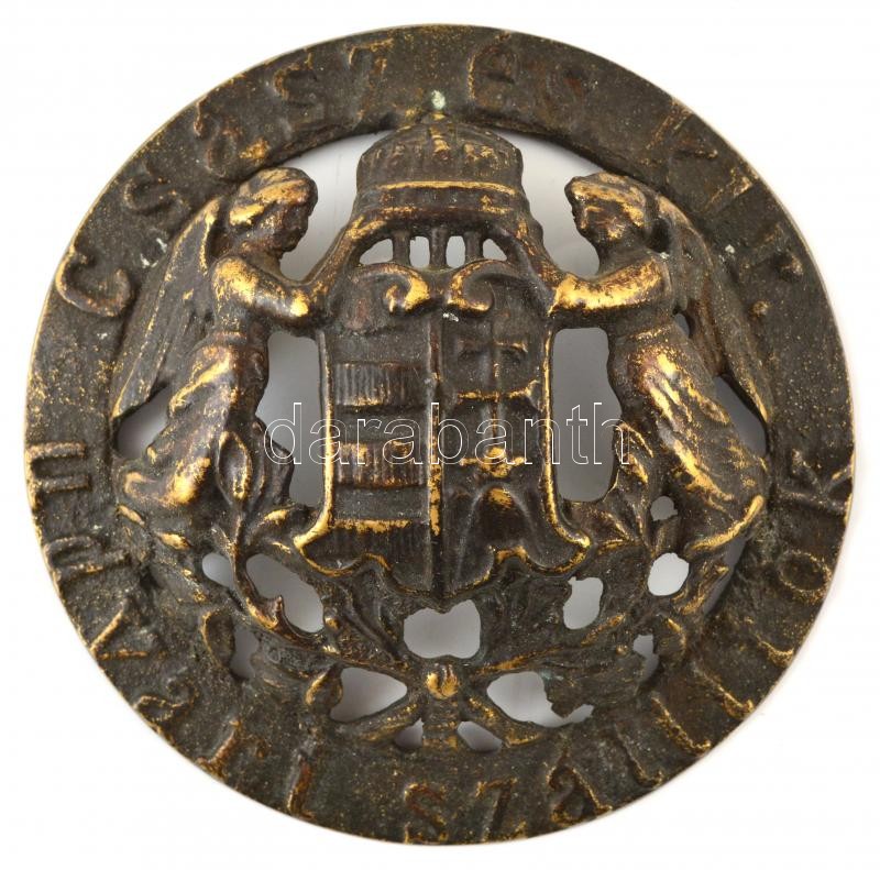 Leírás: cca 1890 Csász. és Kir. Udvari Szállítók. Angyalos magyar címerrel díszített fém embléma, cégér. / Royal supplier bronze sign d: 12 cm