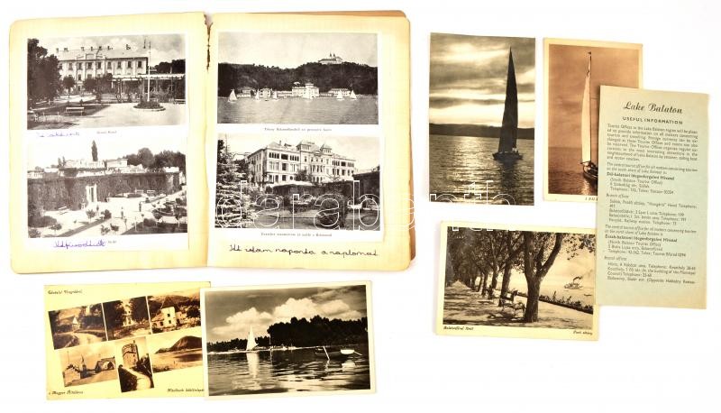 1936 Balatoni nyaralás naplója, beragasztott nyomtatványokkal is, rajzolt térképpel, 10 sztl. lev.+angol nyelvű prospektus és 5 db képeslappal (1943-1948-as bélyegzésekkel.