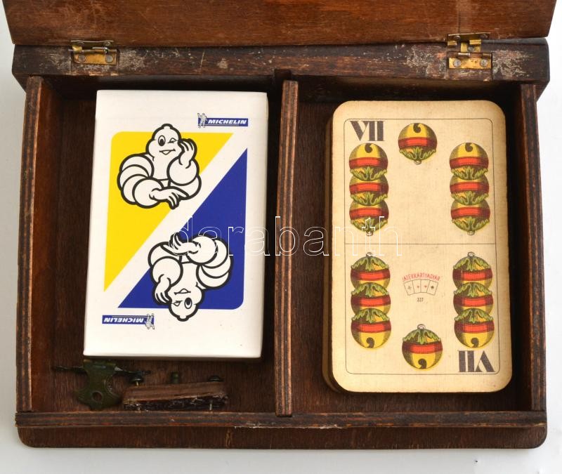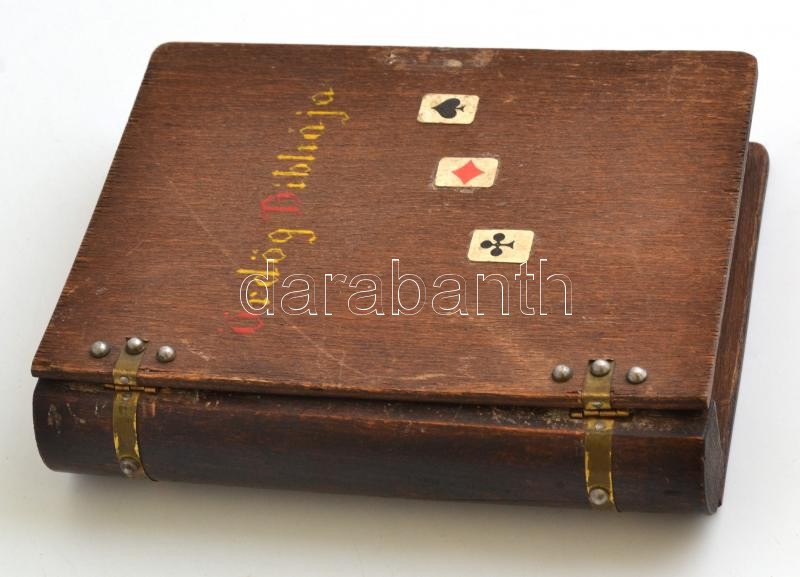 Leírás: Ördög Bibliája feliratú, könyv formájú fadoboz két pakli kártyával 15x18 cm
