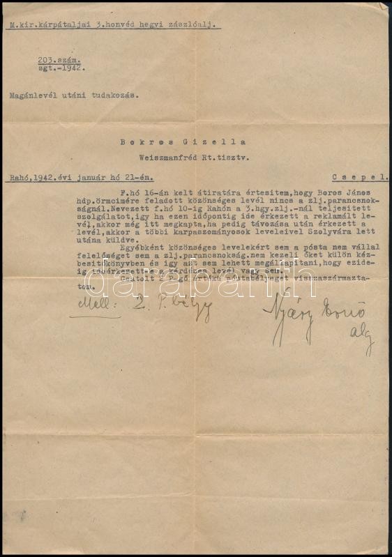 1942 M. Kir. kárpátaljai 3. honvéd hegyi zászlóalj válasza, Bokros Giz... https://www.darabanth.com/hu/360-Gyorsarveres/360.0/Mutargy-papirregiseg-egyeb/Militaria~500027/1942-M-Kir-karpataljai-3-honved-hegyi-zaszloalj-valasza-Bokros-Gizella-a-Weiszmanfred-Rt~II2071833