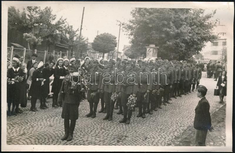 Leírás: cca 1942 Veszprém, virággal köszöntött katonai század, vitéz Mészáros (?) pecsétjével jelzett vintage fotólap, 8,5x13,3 cm