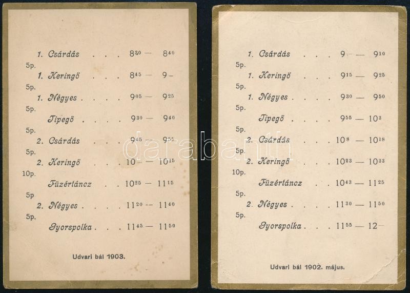 1902-1903 Udvari Bál táncrendjei 2 db 11x7,5 cm https://www.darabanth.com/hu/360-Gyorsarveres/360.0/Mutargy-papirregiseg-egyeb/Nyomtatvanyok~500029/1902-1903-Udvari-Bal-tancrendjei-2-db-11x7-5-cm~II2076351