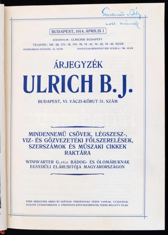 1914 Bp., Ulrich B. J. mindennemű csövek, légszesz-, víz és gőzvezeték... https://www.darabanth.com/hu/360-Gyorsarveres/360.0/Mutargy-papirregiseg-egyeb/Nyomtatvanyok~500029/1914-Bp-Ulrich-B-J-mindennemu-csovek-legszesz-viz-es-gozvezeteki-folszerelesek-szer~II2070018