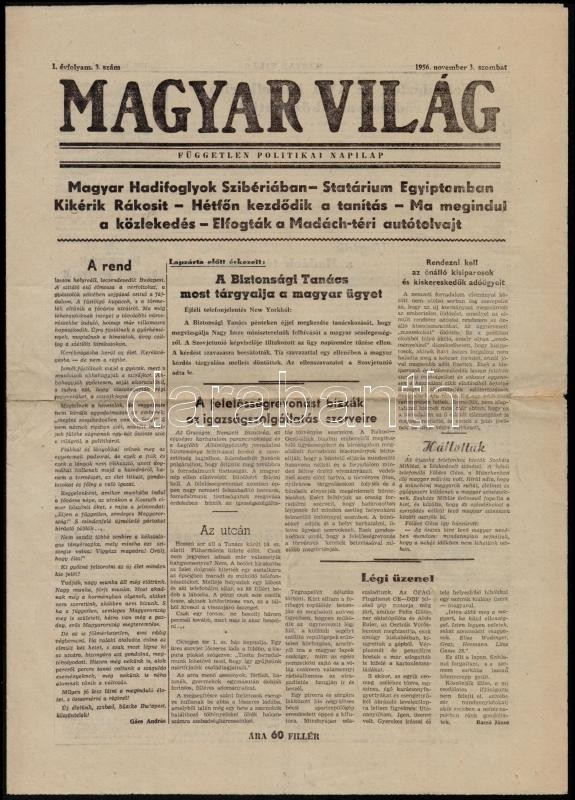 1956 Magyar Világ. I. évf. 3. sz., 1956. november 3., Szerk.: Szolcsán... https://www.darabanth.com/hu/360-Gyorsarveres/360.0/Mutargy-papirregiseg-egyeb/Nyomtatvanyok~500029/1956-Magyar-Vilag-I-evf-3-sz-1956-november-3-Szerk-Szolcsanyi-Ferenc-Bp-Egyetemi-Ny~II1864771