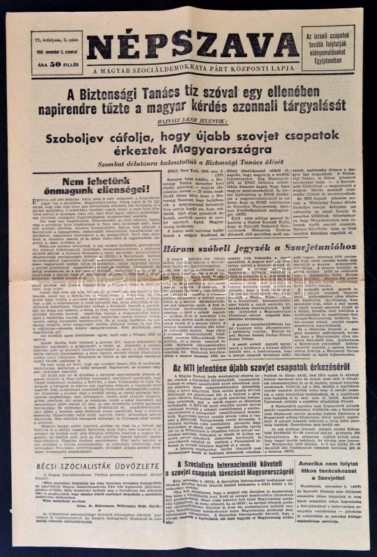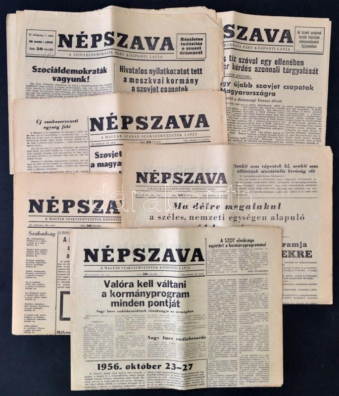 1956 Népszava. Magyar Szociáldemokrata Párt központi lapja, 7 száma, 1956. október 26., 29.-31., november 1-3., változó, egy szám szakadozott, viseltes.