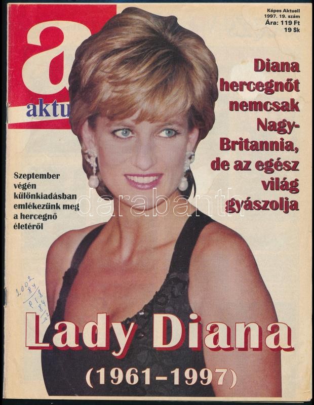 1997 Képes Aktuelle, 1997. 19 sz., Lady Diana halálával foglalkozó írá... https://www.darabanth.com/hu/360-Gyorsarveres/360.0/Mutargy-papirregiseg-egyeb/Nyomtatvanyok~500029/1997-Kepes-Aktuelle-1997-19-sz-Lady-Diana-halalaval-foglalkozo-irasokkal~II2071809