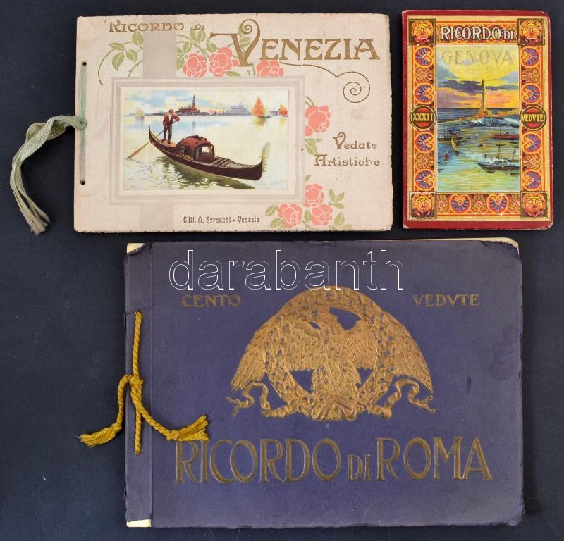 Vegyes leporelló/album tétel, 3 db: Ricordo di Genova, Ricordo di Venezia, Ricordo di Roma. Fekete-fehér és színes képekkel. Különféle kiadásban. Változó kötésben, az egyik borító szakadozott, egy másik kissé sérült, kopott.