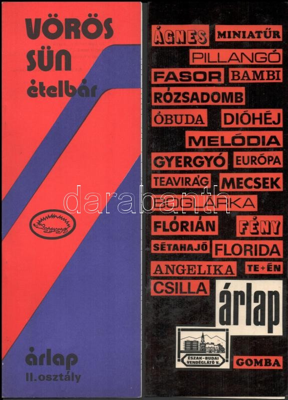 cca 1976 5 db retró étlap, árlap (Vörös Sün, Utasellátó, Rózsadomb Esp... https://www.darabanth.com/hu/360-Gyorsarveres/360.0/Mutargy-papirregiseg-egyeb/Nyomtatvanyok~500029/cca-1976-5-db-retro-etlap-arlap-Voros-Sun-Utasellato-Rozsadomb-Espresso-stb~II2073187