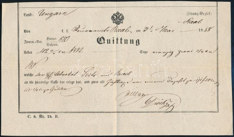 1858 Állami nyugta magyar személy részére https://www.darabanth.com/hu/360-Gyorsarveres/360.0/Mutargy-papirregiseg-egyeb/Okmanyok~500017/1858-Allami-nyugta-magyar-szemely-reszere~II2073203