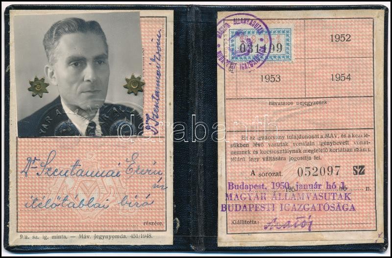 1950 Bp., Magyar Államvasutak által ítélőtáblai bíró számára kiadott f... https://www.darabanth.com/hu/360-Gyorsarveres/360.0/Mutargy-papirregiseg-egyeb/Okmanyok~500017/1950-Bp-Magyar-Allamvasutak-altal-itelotablai-biro-szamara-kiadott-fenykepes-igazolva~II2075993