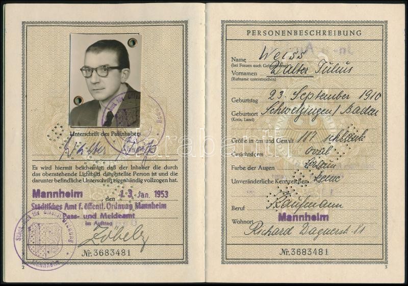 1953 Német útlevél érvénytelenítve https://www.darabanth.com/hu/360-Gyorsarveres/360.0/Mutargy-papirregiseg-egyeb/Okmanyok~500017/1953-Nemet-utlevel-ervenytelenitve~II2072208