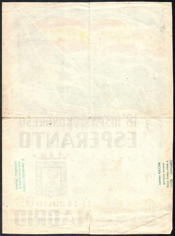 Leírás: 1957 Eszperantó kongresszus, plakát, szakadással, 29,5×22 cm