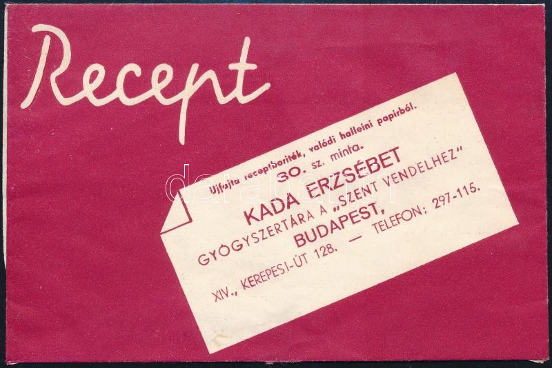 Kada Erzsébet Gyógyszertára a Szent Vendelhez (Bp., XIV.) receptboríté... https://www.darabanth.com/hu/360-Gyorsarveres/360.0/Mutargy-papirregiseg-egyeb/Reklam~500021/Kada-Erzsebet-Gyogyszertara-a-Szent-Vendelhez-Bp-XIV-receptboritekja~II2073568