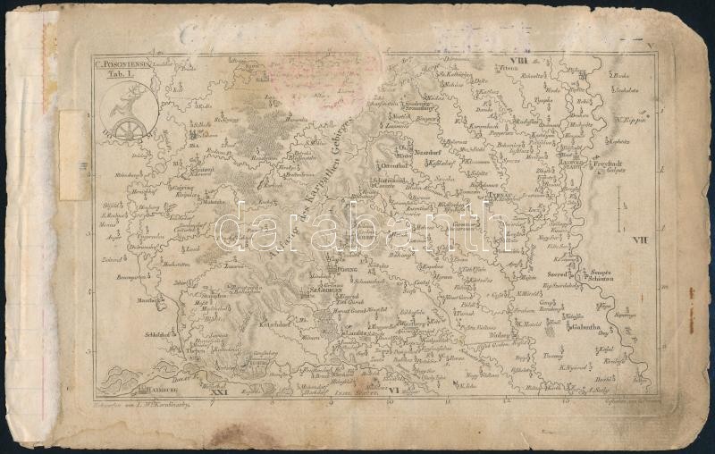 Leírás: 1804 Comitatus Posoniensis, rézmetszetű térkép, tervezte: Ján Matej Korabinszky (1740-1811), javított, foltos, 12×19 cm