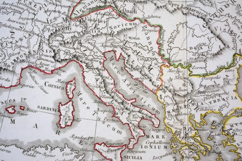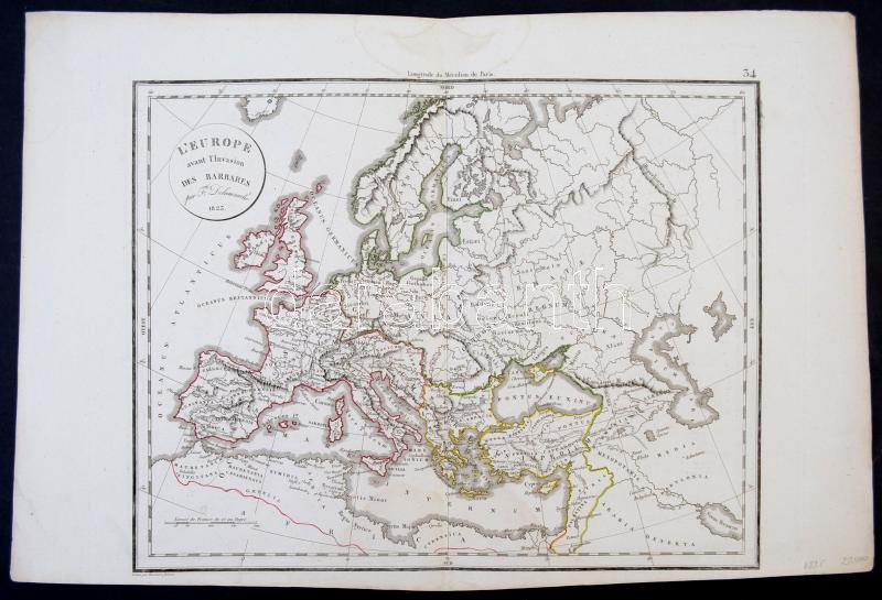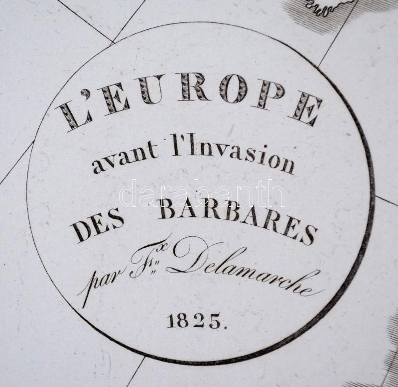1825 Európa a barbárok betörése előtt. Nagyméretű határszínezett rézmetszetű térkép. / 1825 Map of Europe before the barbars. Europa avant l'invasian des barbares par Fr. Delamarche. Colored engraving 49x33 cm,
