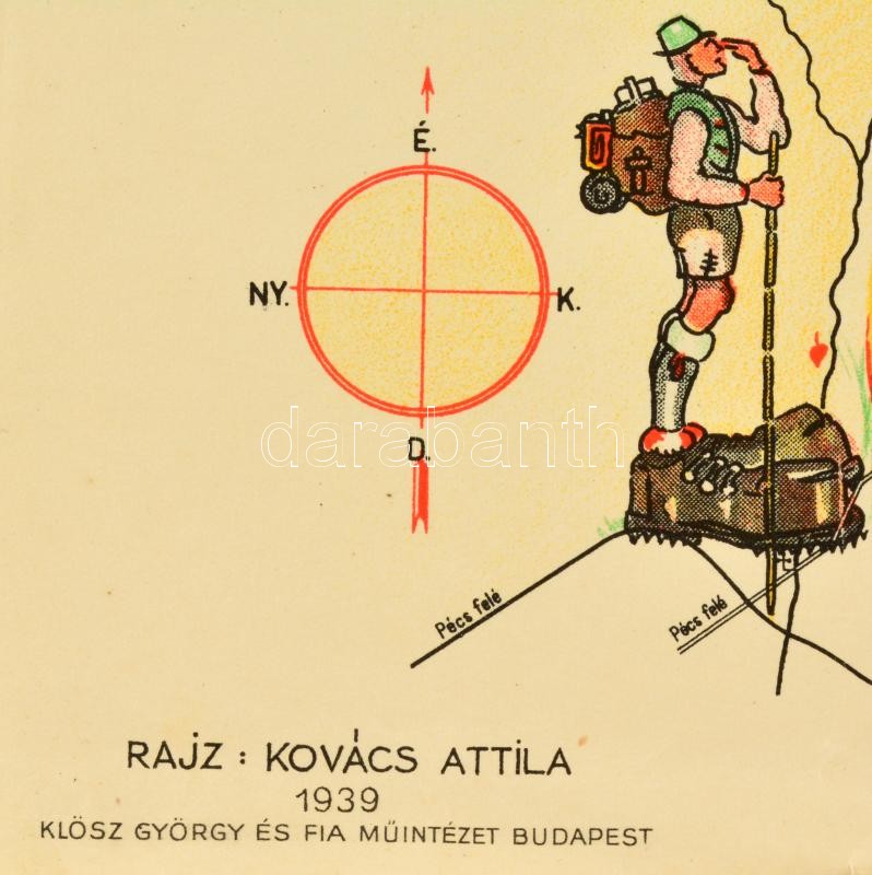Leírás: 1939 A Keleti-Mecsek színes turistatérképe, Kiadja Pécs Szab kir. város idegenforgalmi hivatala. Rajz: Kovács Attila. Klösz nyomda. 31x34 cm