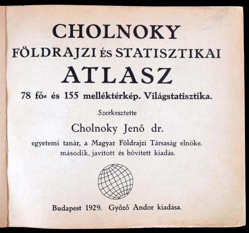 Dr. Cholnoky JenÅ‘ (szerk.): Földrajzi és statisztikai atlasz. 78 fÅ‘ és 155 melléktérkép, világstatisztika. Szerk.: - -. Bp., 1929, GyÅ‘zÅ‘ Andor. Második, javÃtott kiadás. Egészvászon-kötés, javÃtott kötéssel és gerinccel, az utolsó néhány lap szélén folttal.
