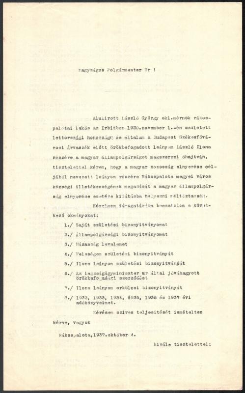 Leírás: 1937 Honosítással kapcsolatos iratok, 5 db