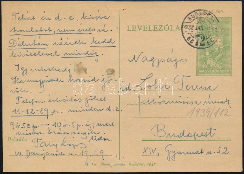 1938 Tary Lajos (1884-1972) festőművész saját kézzel írt lapja Lohr F... https://www.darabanth.com/hu/360-Gyorsarveres/360.0/Mutargy-papirregiseg-egyeb/Tortenelmi-dokumentumok-keziratok-erdekessegek~500018/1938-Tary-Lajos-1884-1972-festomuvesz-sajat-kezzel-irt-lapja-Lohr-Ferenc-festomuvesznek~II2074841
