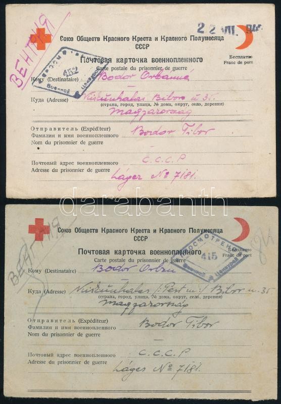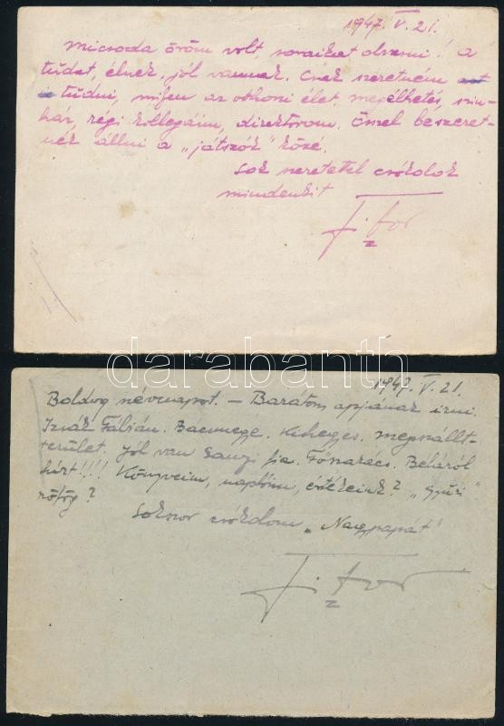 Leírás: 1947 Bodor Tibor (1921-2000) színész hadifogságból írt levelezőlapjai, 2 db