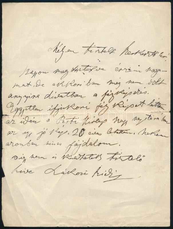 Rákosi Szidi (1852-1935) színésznő saját kézzel írt levele egy újság szerkesztőjének, melyben jelzi, hogy nincs fiatalkori képe, mert akkoriban még nem volt annyira divatban a fényképezés, ezért nem küldhet neki