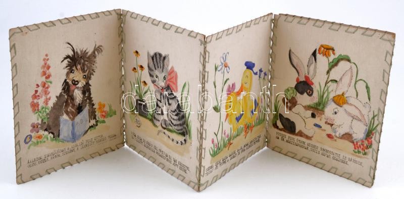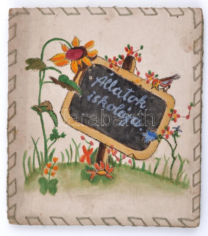 cca 1940-1950 Állatok iskolája, kétoldalas amatőr gyerek kifestő, kézi fűzéssel, kézi rajzolással, utólagos színezéssel, festéssel, jelzés nélkül, 16,5x74,5 cm
