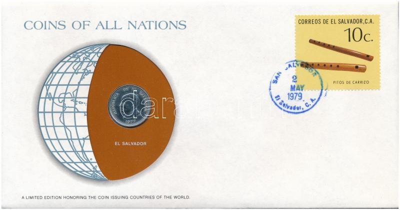 Salvador 1977. 50c "Nemzetek pénzérméi" felbélyegzett borítékban, bélyegzéssel T:1 Salvador 1977. 50 Centavos "Coins of all Nations" in envelope with stamp and stamping C:UNC