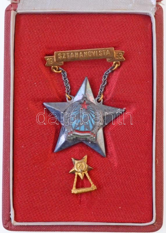 Leírás: 1953. "Sztahanovista" zománcozott fém kitüntetés, miniatűrrel, kopottas dísztokban T:1-