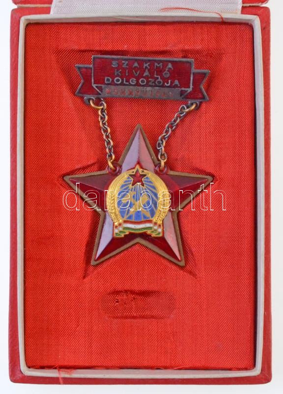 ~1950. "A Szakma Kiváló Műszaki Dolgozója - Könnyűipar" zománcozott jelvény és miniatűr Rákosi-címeres dísztokban, hátlapon gravírozott "65094" sorszámmal T:2