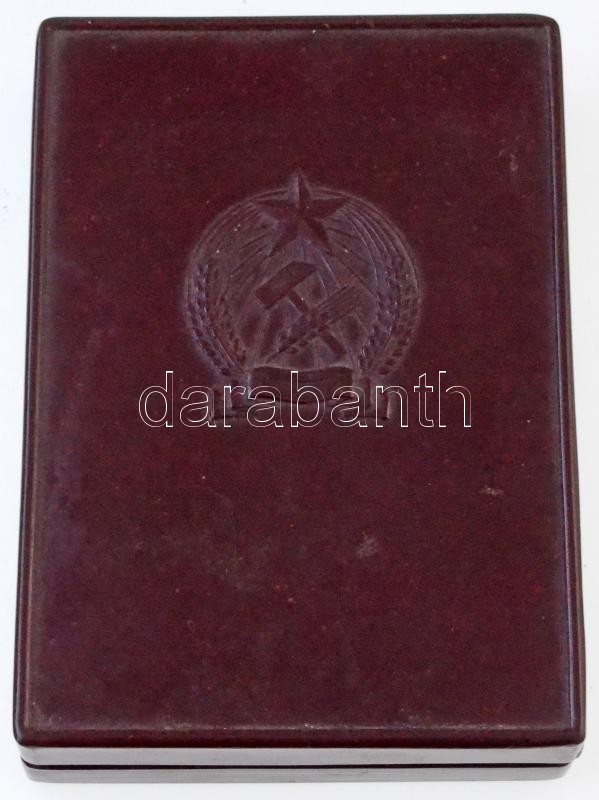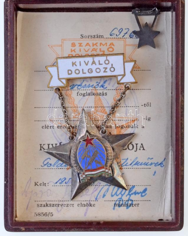 Leírás: ~1950. "Kiváló dolgozó" Rákosi-címeres zománcozott fém kitüntetés dísztokban, miniatűrrel, viselői igazolvánnyal T:2