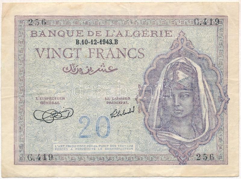 Algeria / Allied Oc... https://www.darabanth.com/hu/360-Gyorsarveres/360.0/Numizmatika/Kulfoldi-bankjegyek~2000013/Algeira-Szovetseges-megszallas-1943-20Fr-TIII-Algeria-Allied-Occupation-1943-20-Francs-~II2077597