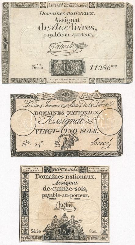 ... https://www.darabanth.com/hu/360-Gyorsarveres/360.0/Numizmatika/Kulfoldi-bankjegyek~2000013/Franciaorszag-1792-15s-plus-25s-plus-10L-Assignata-TIII-III--France-1792-15-Sols-plus-25-Sols-plus-10-Liv~II2070110