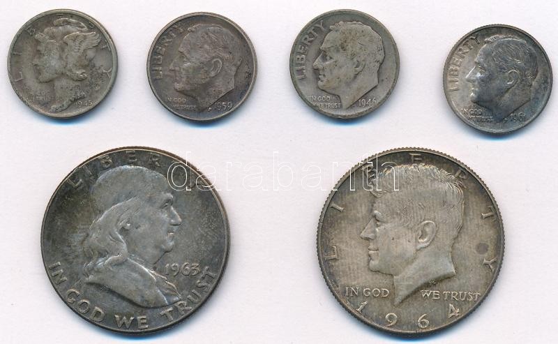 USA 1945-1961. Dime Ag (4xdiff) + 1963. 1/2 Dollar Ag "Franklin" + 1964. 1/2 Dollar Ag "Kennedy" C:XF-F