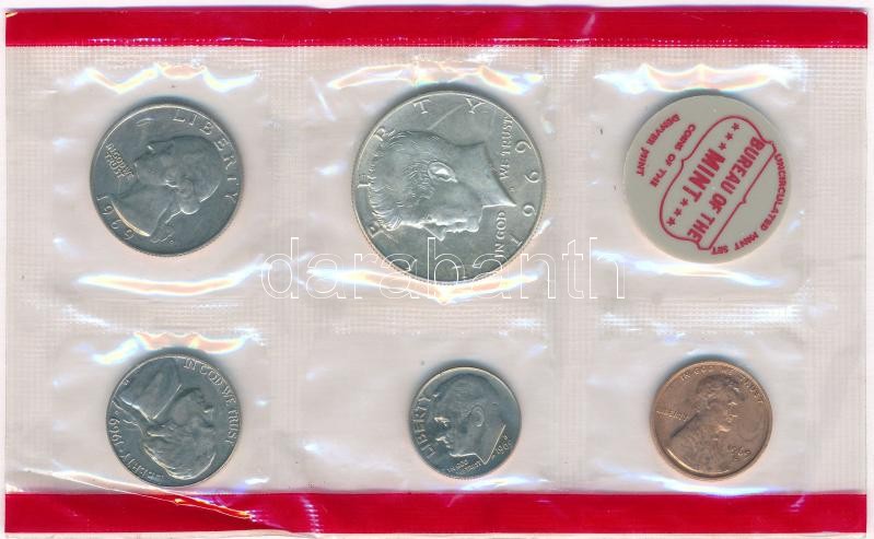 USA 1969D 1 Cent - 1/2 Dollar (5xdiff) coin set in foil packing, with plastic jeton of the Denver mint C:UNC