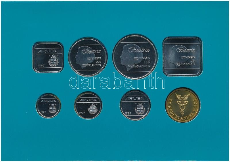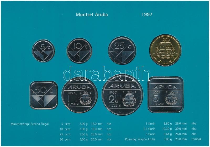 ... https://www.darabanth.com/hu/360-Gyorsarveres/360.0/Numizmatika/Kulfoldi-fem-es-ezustpenzek~2000014/Aruba-1997-5c-5Fl-7xklf-plus-Aruba-emlekerem-szettben-T1-Aruba-1997-5-Cents-5-Florin-7xdif~II2072857