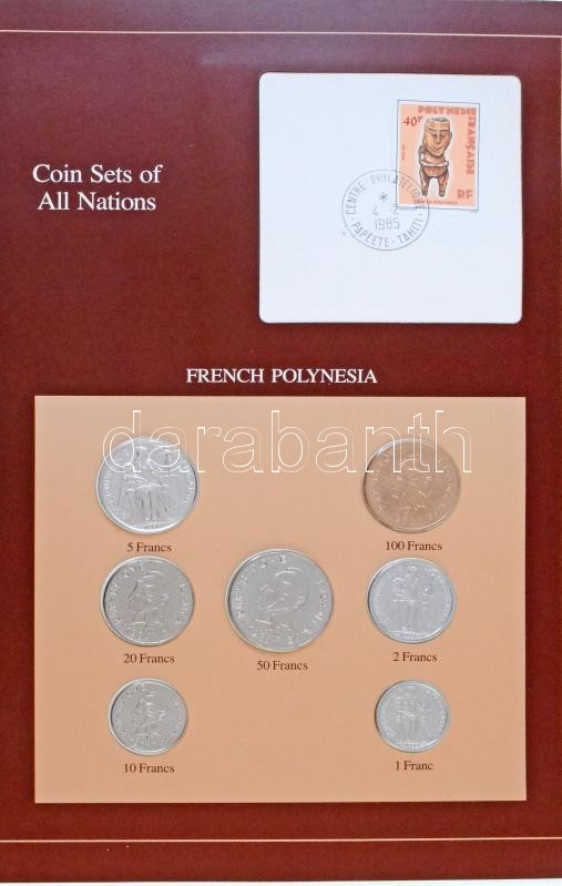 French Polynesia 1984-1986. 1 Franc - 100 Francs (7xdiff) "Coin Sets of All Nations" coin set on cardboard with stamp C:UNC