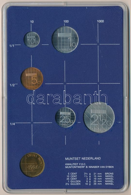 Leírás: Hollandia 1986. 10c-2 1/2G (5xklf) + "Utrechti Verde" zseton plasztiktokos szettben T:1 Netherlands 1986. 10 Cent - 2 1/2 Gulden (5xdiff) + "Utrecht Mint" jeton in plastic case C:UNC
