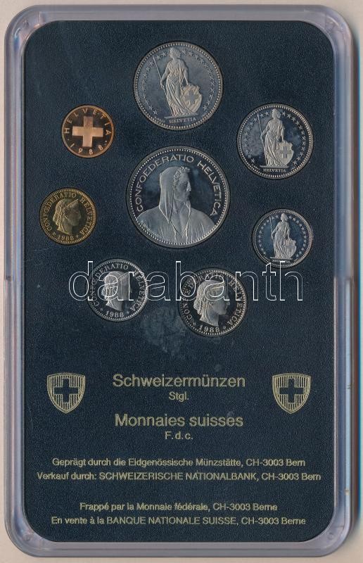 Switze... https://www.darabanth.com/hu/360-Gyorsarveres/360.0/Numizmatika/Kulfoldi-fem-es-ezustpenzek~2000014/Svajc-1988-1r-5Fr-8xklf-forgalmi-szett-muanyag-tokban-TPP--Switzerland-1988-1-Rappen-5-Fra~II2069578