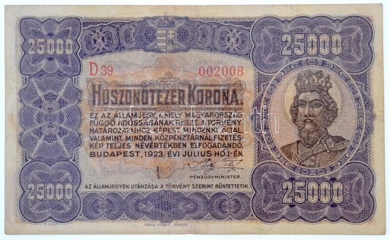Leírás: 1923. 25.000K "Orell Füssli Zürich" piros sorszám "D39 002008" T:III Hungary 1923. 25.000 Korona "Orell Füssli Zürich" red serial "D39 002008" C:F