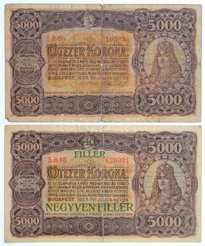 Leírás: 1923. 5000K "Magyar Pénzjegynyomda Rt. Budapest" + 1923. 5000K T.W. jelöléssel, nyomdahely jelölés nélkül "40 FILLÉR NEGYVEN FILLÉR" felülbélyegzéssel T:IV,III-