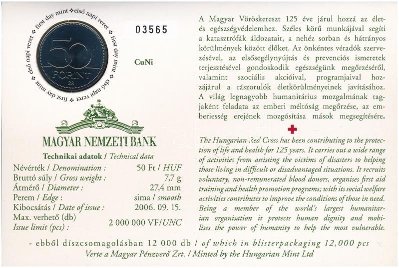 Leírás: 2006. 50Ft "125 éves a Magyar Vöröskereszt" első napi veret számozott emléklapon T:1