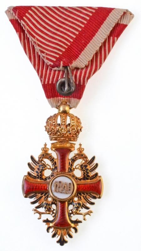 Hungary 1870-1918. "Order of Franz Joseph, Knight's Cross with a War decoration" Au decoration hallmarked on ring, with ribbon, with "V. Mayers Söhne" makers mark, openable back C:XF