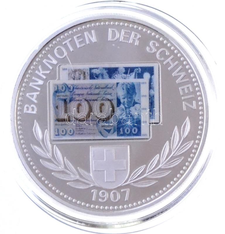 Svájc DN "Banknoten der Schweiz 1907 / Billets de Banque de Suisse - Banconote della Svizzera" ezüstözött Cu-Ni emlékérem 100Fr svájci bankjegy multicolor képével, tanúsítvánnyal (40mm) T:PP Switzerland ND "Banknoten der Schweiz 1907 / Billets de Banque de Suisse - Banconote della Svizzera" silver plated Cu-Ni commemorative medallion with the multicolor image of 100 Francs banknote, with certificate (40mm) C:PP