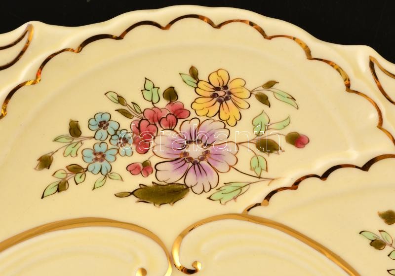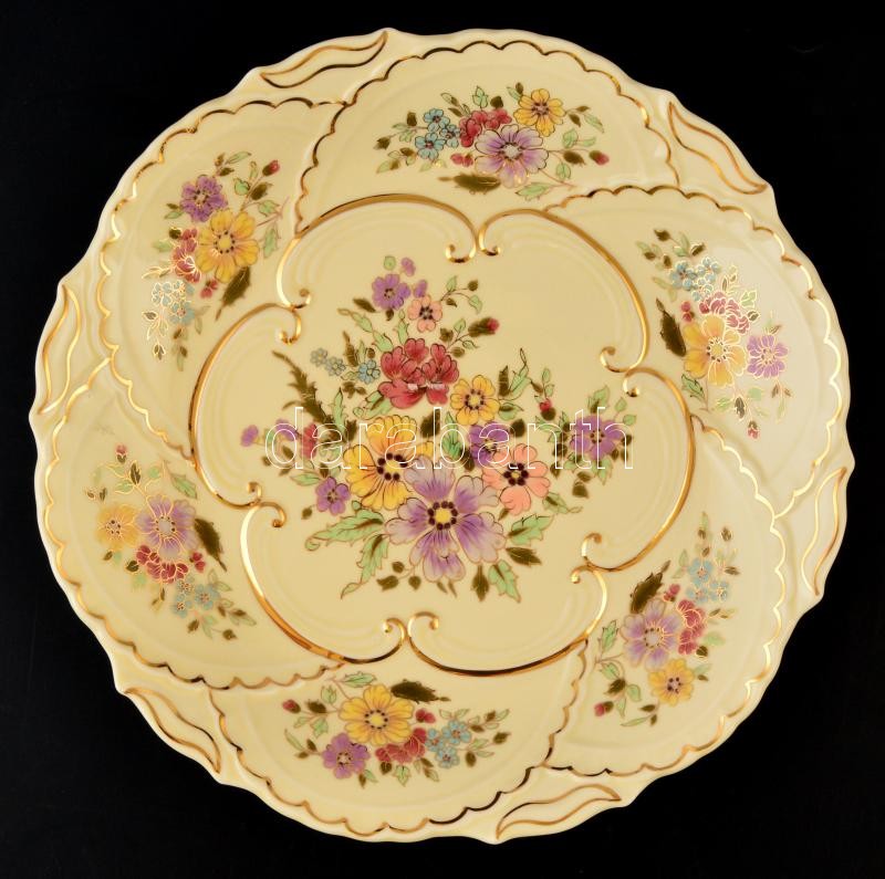 Leírás: Zsolnay virág mintás falitányér, kézzel festett, jelzett, máz alatti hajszál repedésekkel, d:29,5 cm
