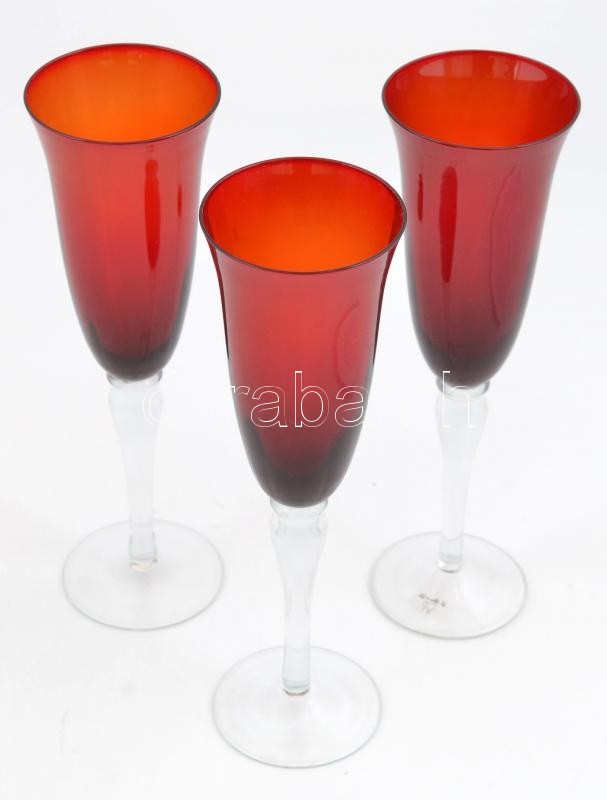 Leírás: Bordó pezsgős poharak (3 db), színtelen talp résszel, hibátlan, m: 24 cm (3×)