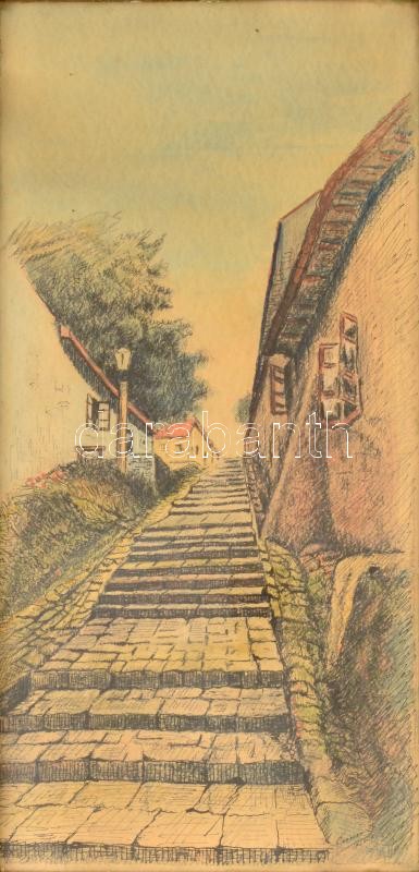 Leírás: Császár jelzéssel: Lépcsősor (Tabán). Akvarell-tus, papír, üvegezett keretben, 53×27 cm