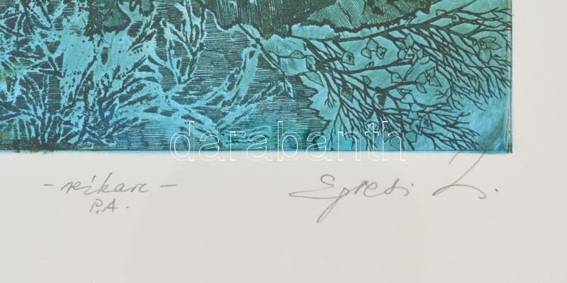 Leírás: Egresi Zsuzsa (1954-): Lepkék lovagja. Színes rézkarc, papír, jelzett, üvegezett keretben, 29×19 cm